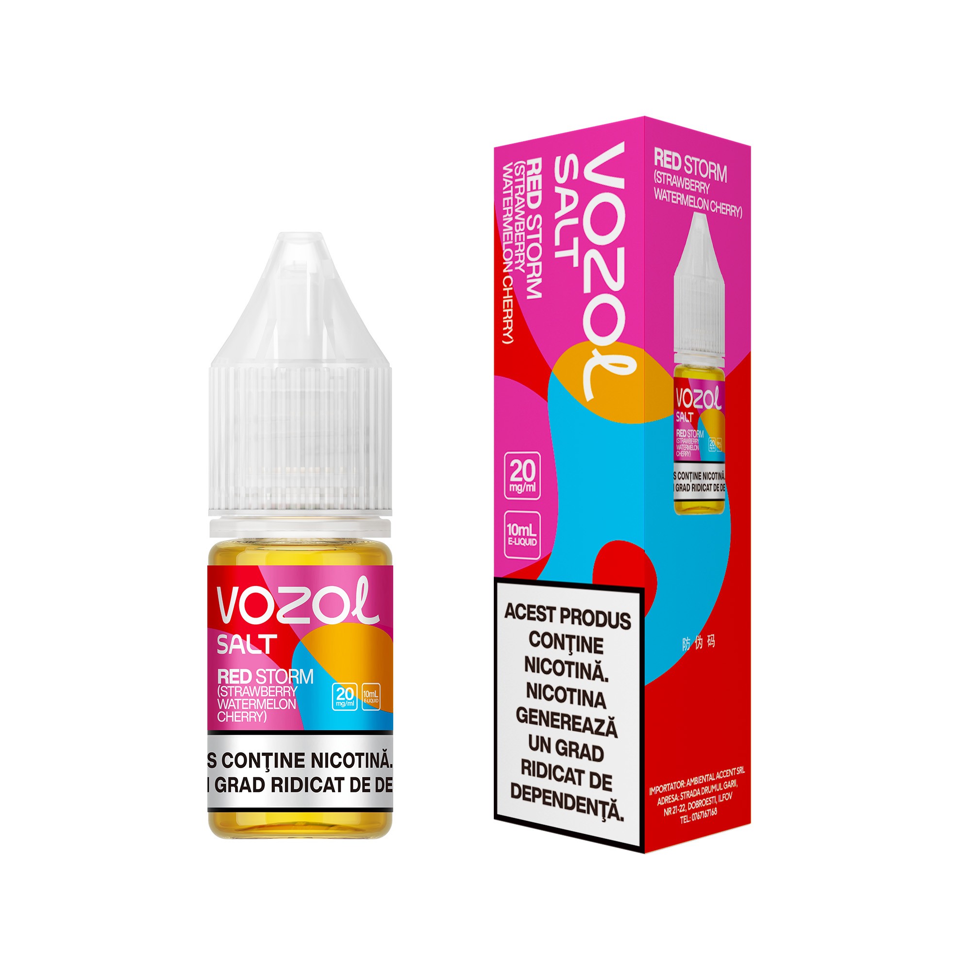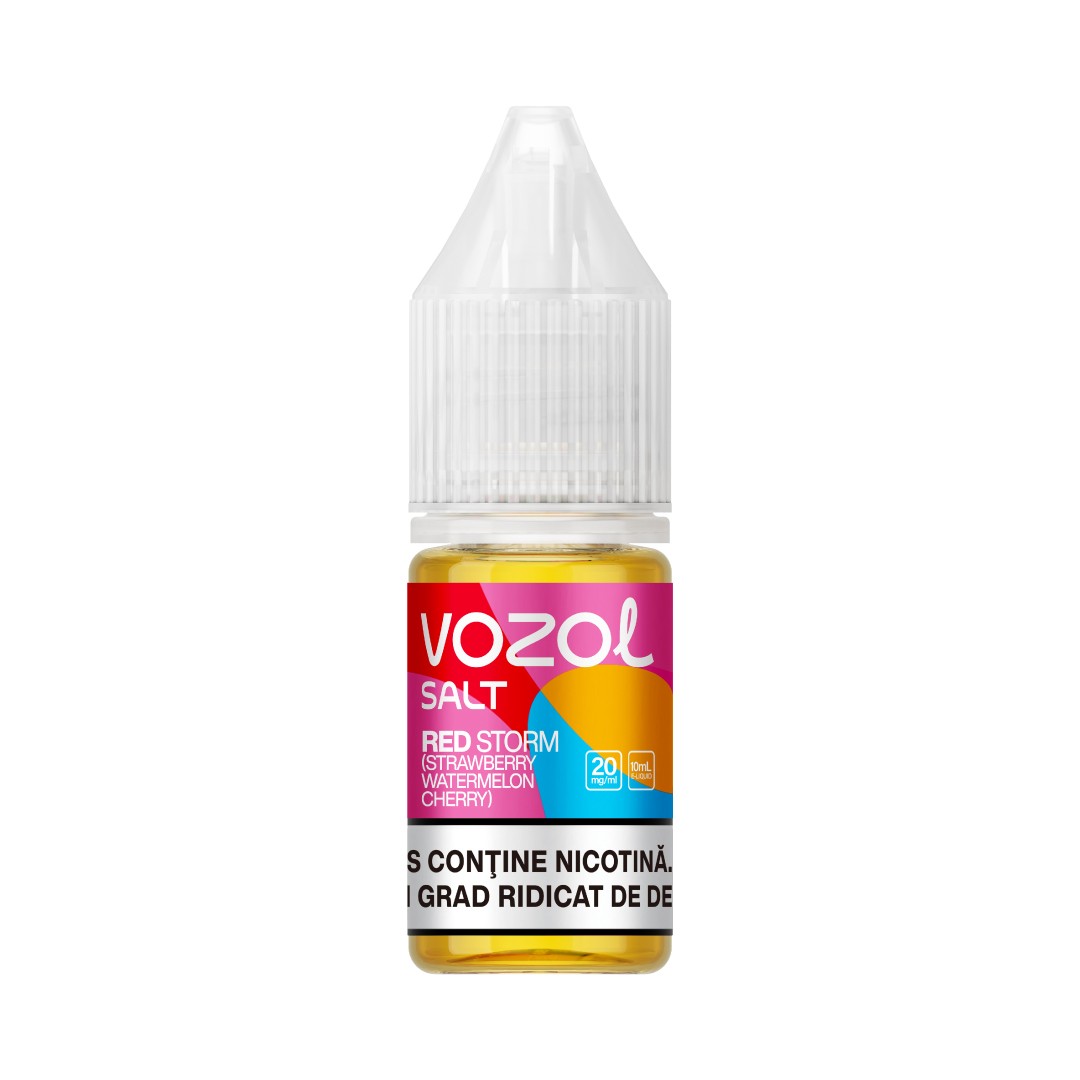 VOZOL SALT RED STORM este o sticluta incarcata cu 10 ml de e-Lichid cu 2% nicotina, cu o aroma delicioasa de capsuni, pepene verde si cirese. Lichidul este special conceput pentru dispozitivele reincarcabile cu lichid. Ingrediente:glicerina vegetala, propilen glicol, nicotina, arome naturale si artificiale. Pachetul contine o sticluta cu lichid si instructiuni de folosire