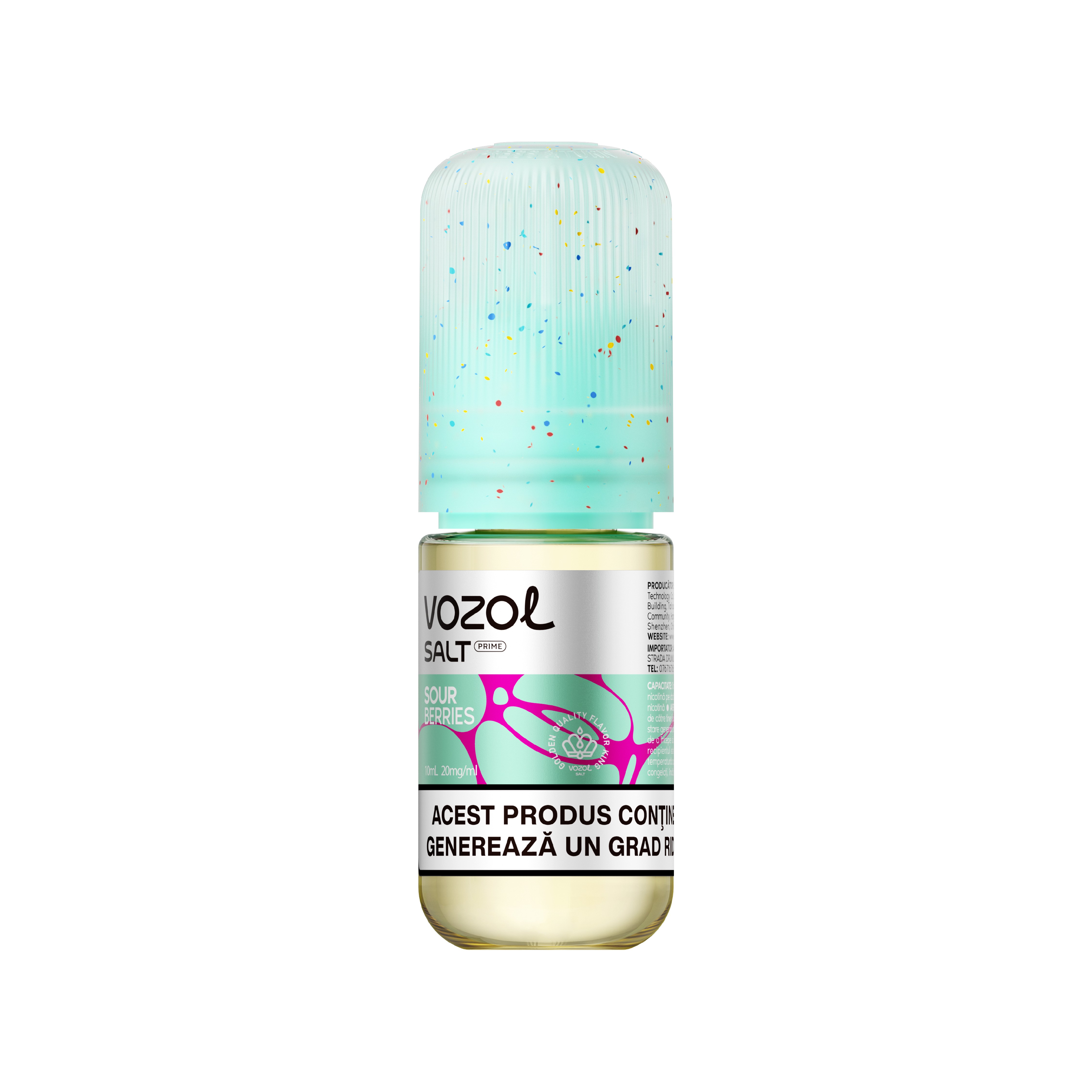 VOZOL SALT PRIME SOUR BERRIES este o sticluta incarcata cu 10 ml de e-Lichid cu 2% nicotina, cu o aroma delicioasa de fructe de pădure. Lichidul este special conceput pentru dispozitivele reincarcabile cu lichid. Ingrediente:glicerina vegetala, propilen glicol, nicotina, arome naturale si artificiale. Pachetul contine o sticluta cu lichid si instructiuni de folosire