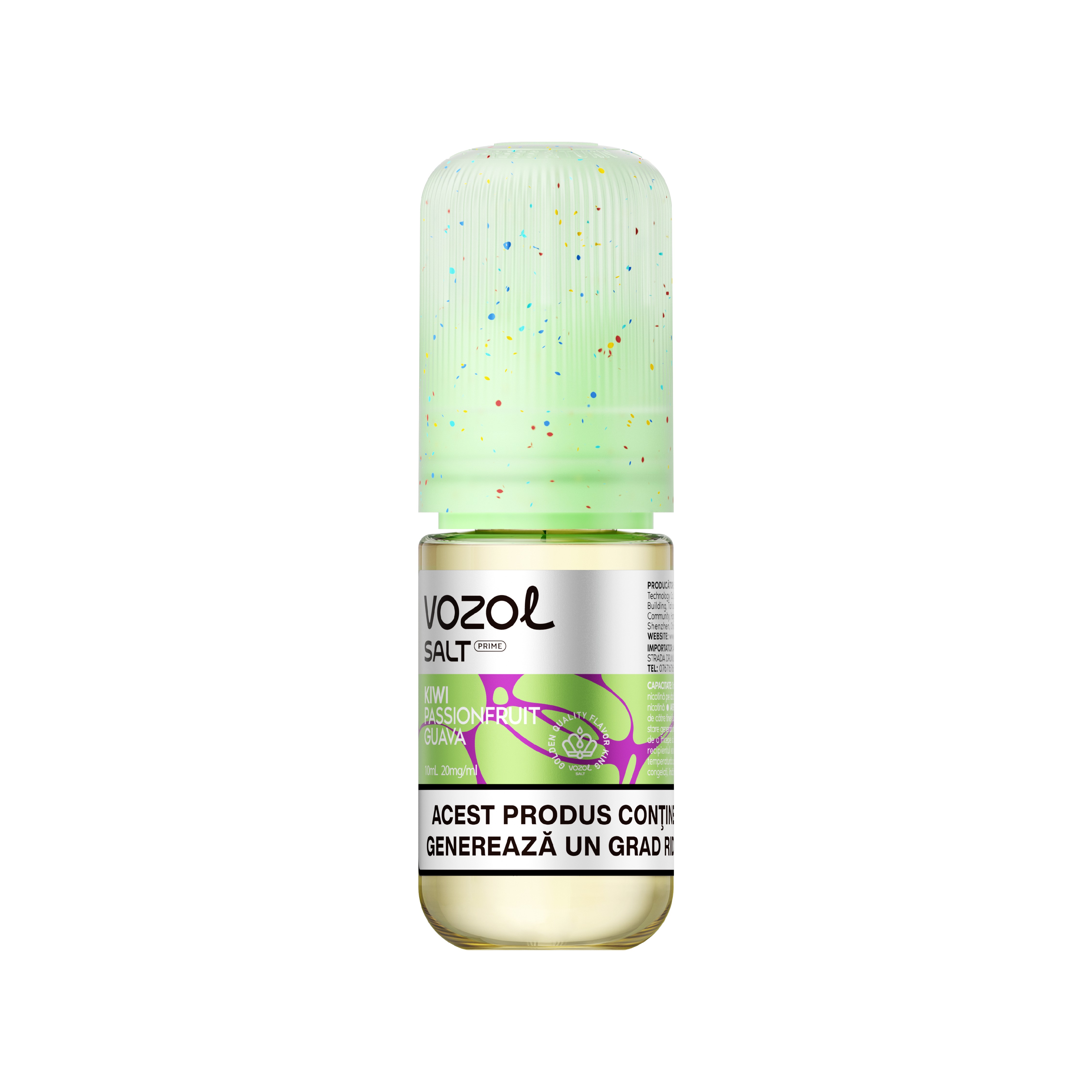 VOZOL SALT PRIME KIWI PASSION FRUIT GUAVA este o sticluta incarcata cu 10 ml de e-Lichid cu 2% nicotina, cu o aroma delicioasa de kiwi, fructul pasiunii si guava. Lichidul este special conceput pentru dispozitivele reincarcabile cu lichid. Ingrediente:glicerina vegetala, propilen glicol, nicotina, arome naturale si artificiale. Pachetul contine o sticluta cu lichid si instructiuni de folosire