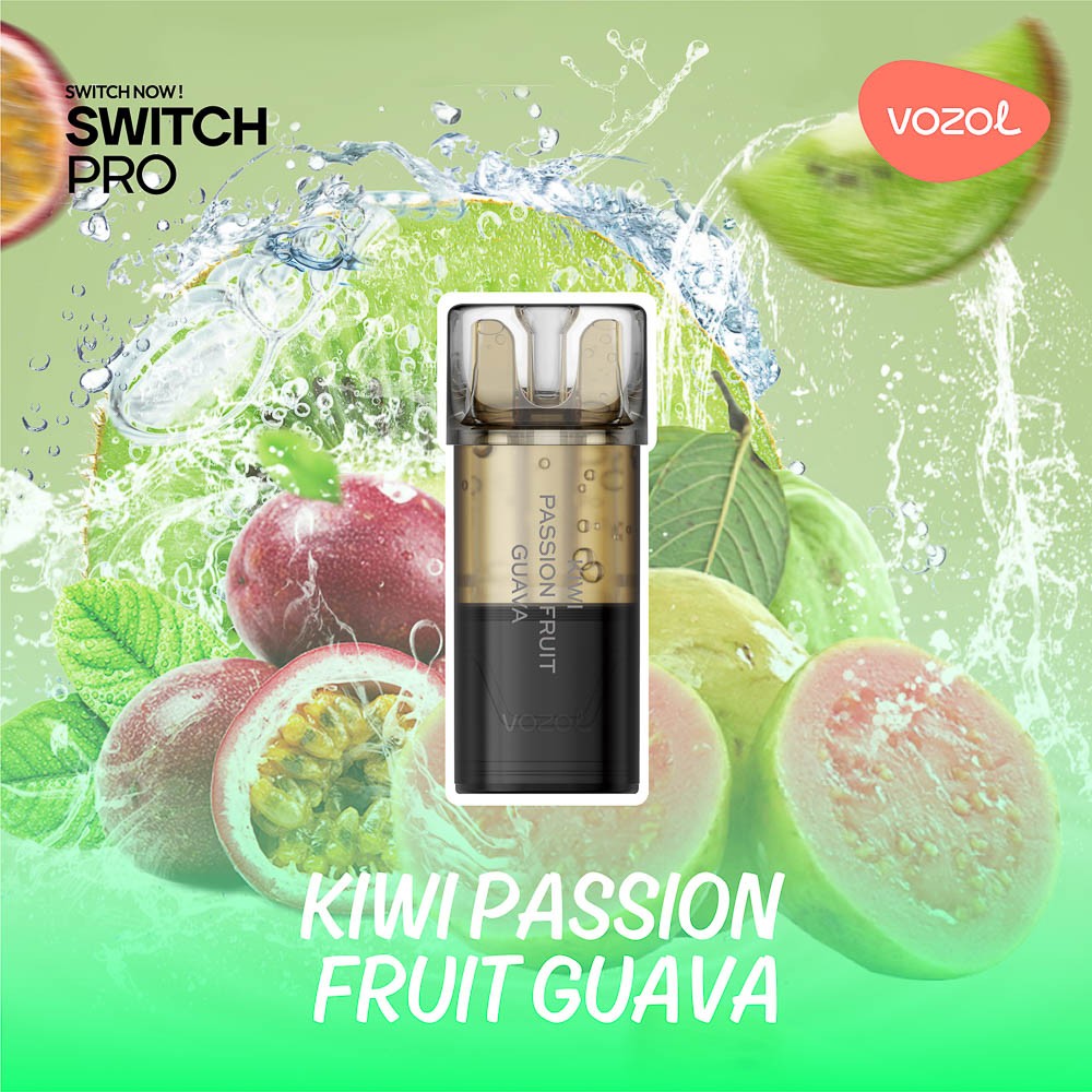 VOZOL SWITCH PRO KIWI PASSION FRUIT GUAVA este un cartus de unica folosinta preumplut cu 2 ml de e-Lichid cu 2% nicotina suficient pentru a savura pana la 800 pufuri cu o aroma delicioasa de kiwi,fructul pasiunii,guava .Sistemul inovator de atomizare si mustiucul ergonomic iti ofera un confort deosebit in timp ce vapezi. Cartusele sunt special concepute pentru dispozitivele SWITCH PRO. Ingrediente:glicerina vegetala, propilen glicol, nicotina, arome naturale si artificiale. Pachetul contine: 2 cartuse SWITCH PRO KIWI PASSION FRUIT GUAVA si instructiuni de folosire. Sistemul permite adăugarea și îndepărtarea rapidă a capsulelor magnetice, fără scurgeri