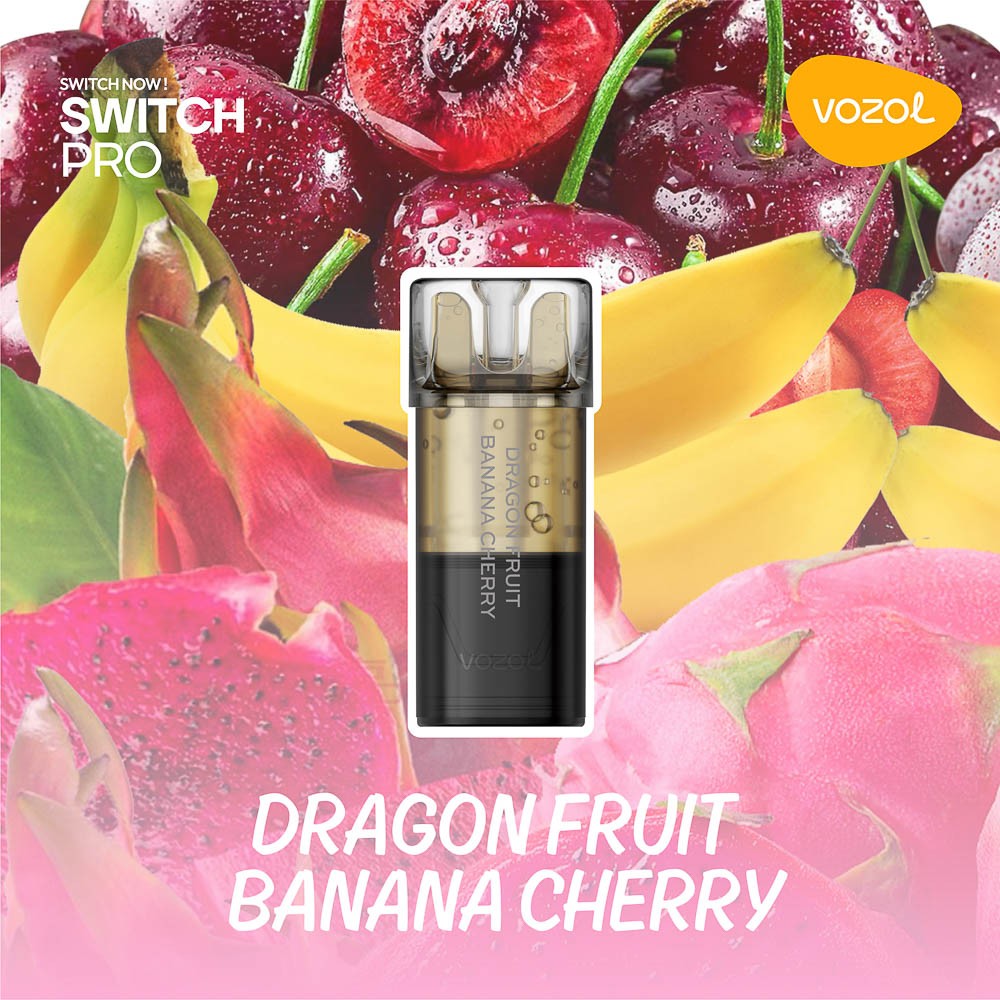 VOZOL SWITCH PRO DRAGON FRUIT BANANA CHERRY este un cartus de unica folosinta preumplut cu 2 ml de e-Lichid cu 2% nicotina suficient pentru a savura pana la 800 pufuri cu o aroma delicioasa de pitaya,banana si cirese. .Sistemul inovator de atomizare si mustiucul ergonomic iti ofera un confort deosebit in timp ce vapezi. Cartusele sunt special concepute pentru dispozitivele SWITCH PRO. Ingrediente:glicerina vegetala, propilen glicol, nicotina, arome naturale si artificiale. Pachetul contine: 2 cartuse SWITCH PRO DRAGON FRUIT BANANA CHERRY si instructiuni de folosire. Sistemul permite adăugarea și îndepărtarea rapidă a capsulelor magnetice, fără scurgeri