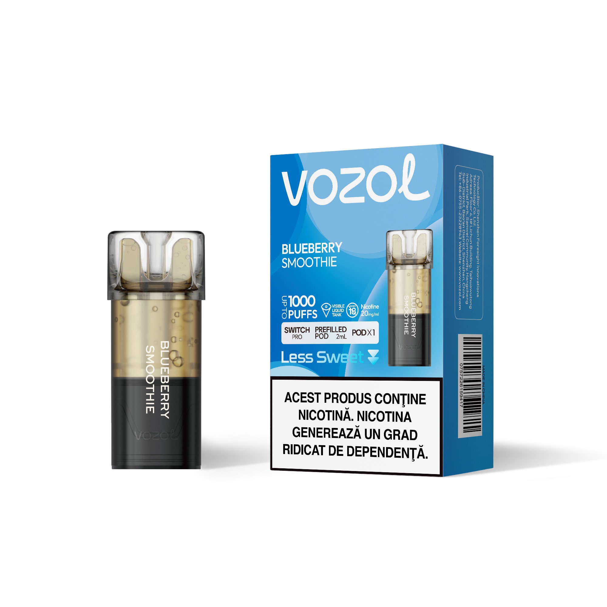 VOZOL SWITCH PRO BLUEBERRY SMOOTHIE este un cartus de unica folosinta preumplut cu 2 ml de e-Lichid cu 2% nicotina suficient pentru a savura pana la 1000 pufuri cu o aroma delicioasa de smoothie de afine.Sistemul inovator de atomizare si mustiucul ergonomic iti ofera un confort deosebit in timp ce vapezi. Cartusele sunt special concepute pentru dispozitivele SWITCH PRO. Ingrediente:glicerina vegetala, propilen glicol, arome naturale si artificiale. Pachetul contine: o capsula SWITCH PRO BLUEBERRY SMOOTHIE si instructiuni de folosire